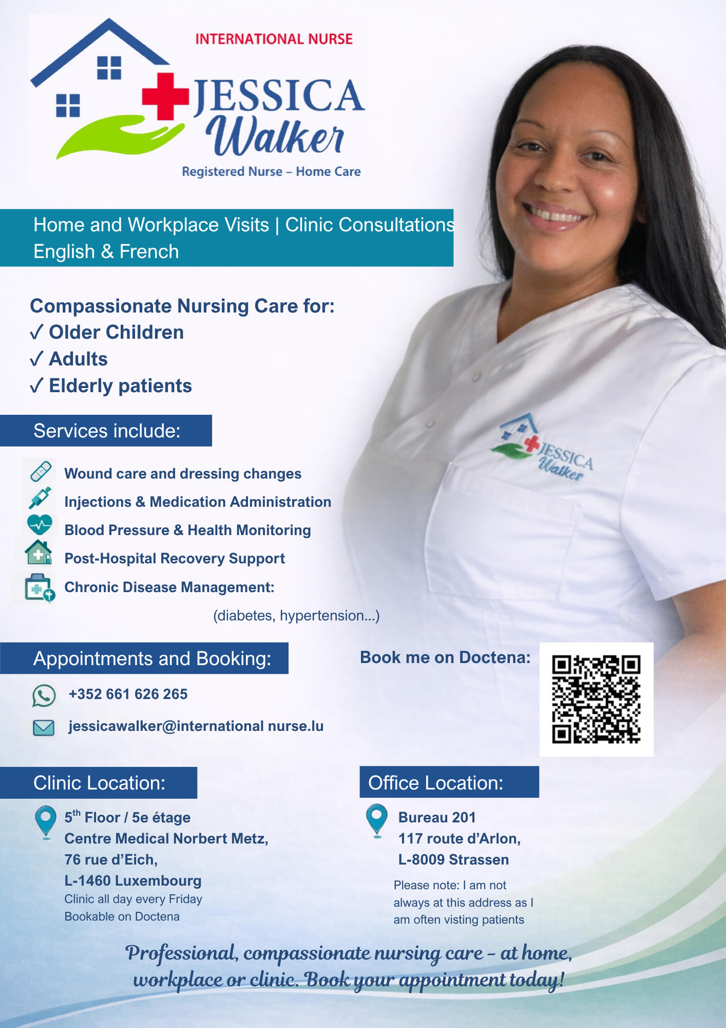 Hello, I’m Jessica Walker — a native English-speaking Registered Nurse, fluent in French.With over 15 years of professional nursing experience across hospital, community, and home care settings, I am dedicated to delivering high-quality, personalised nursing services to clients in Luxembourg City and the surrounding areas.